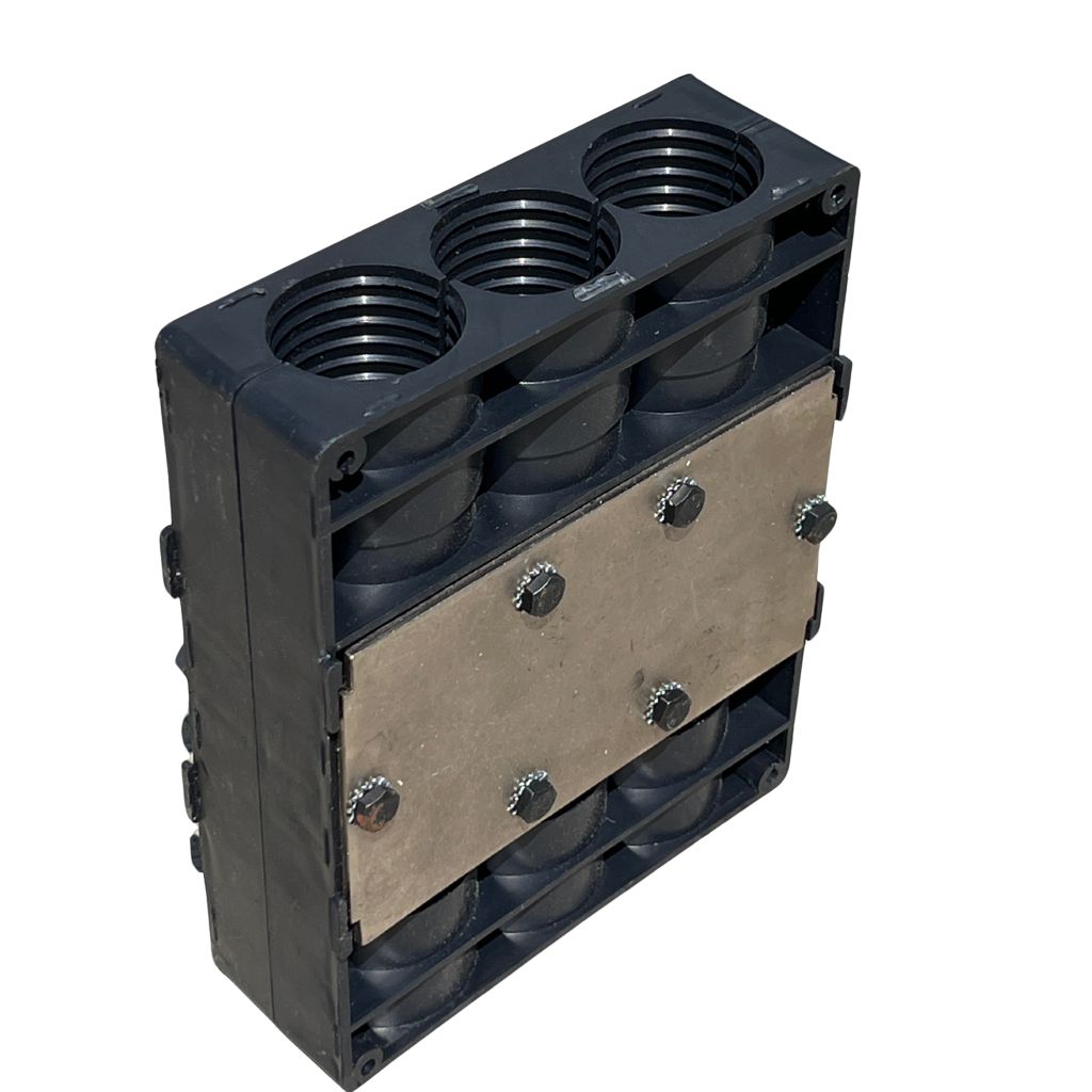 El soporte unión o caja de empalme para tritubo de fibra óptica se compone de una unión de goma y un soporte inyectado en dos mitades para asegurar el acoplamiento de dos tramos de tritubo, con la ayuda de placas metálicas y tornillería se realiza la sujeción de ambas mitades para cerrar y contener el acoplamiento de los tritubos.